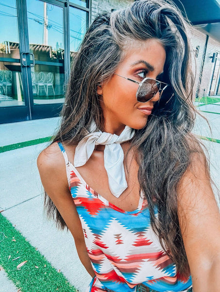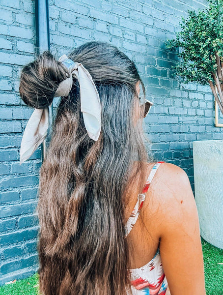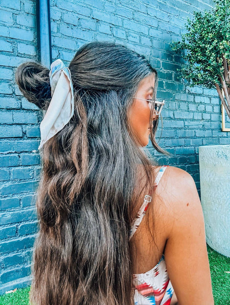 This multipurpose fashion Beige Buckaroo Scarf is a mini version of our Wild Rag and has so many uses.  Wear it as a kerchief, tie it onto a tote, wrap it around your wrist—trust us, you'll never tire of the ways to wear this timeless bandana.