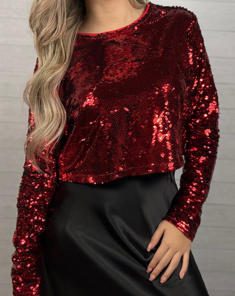 VC1203, 2 SMALL 2 MEDIUM 2 LARGE, ROUND NECKLINE, LONG SLEEVES, BACK BUTTON CLOSURE, SOLID, SEQUIN PATTERN, CROP TOP, HOLIDAY, SHELL: 97%POLYESTER, 3%SPANDEX, LINING: 100%POLYESTER,