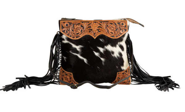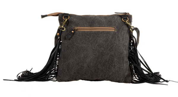 This bag is makes a grand impression with its wonderfully classic design. A scalloped top panel of hand-tooled leather in warm caramel compliments the beautiful hair-on hide; side leather fringe in black completes the stunning look. The interior features a zippered pocket and zipper close top. The back is smoky charcoal woven canvas with separate zippered pocket. Matching detachable shoulder strap is fully adjustable.