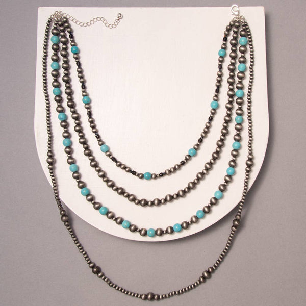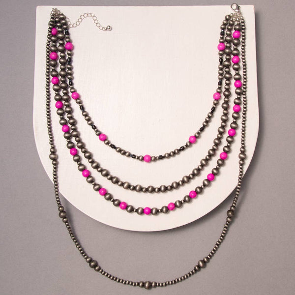 This multi-strand Western necklace layers pink or turquoise-toned beads in a dynamic graduated silhouette, offering rustic charm with a modern touch. The lightweight strands drape comfortably around the neck, creating an effortlessly styled choker or collar look. Finished with a subtle textured shine, it adds depth and movement to both casual and elevated outfits.