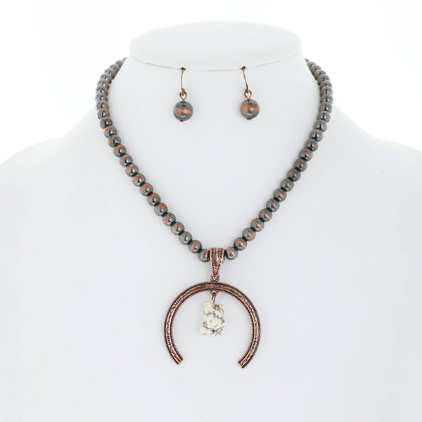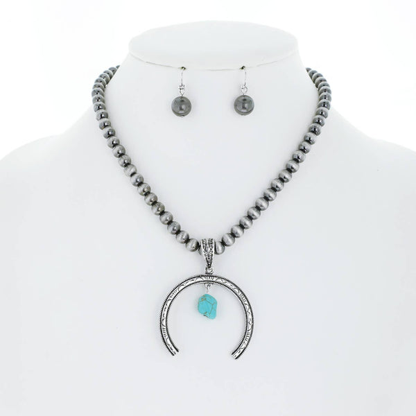 Enhance your Western-inspired look with our Western Naja Pendant Navajo Pearl Beaded Necklace Set. This set features a captivating Naja pendant, showcasing a traditional Southwestern design. The pendant is beautifully adorned with intricate detailing and hangs from a Navajo pearl beaded necklace, adding an authentic touch to your style. The Navajo pearls are handmade and crafted with care, providing a unique and rustic aesthetic. The necklace is adjustable, allowing you to find the perfect fit for your neckline. The set also includes matching earrings, completing the coordinated ensemble.