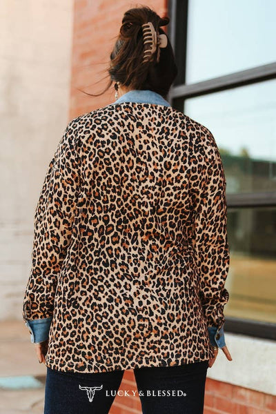 Elevate your fall outerwear collection with this statement-making leopard print longline jacket from Lucky & Blessed. Designed with a structured silhouette and eye-catching contrast denim collar and cuffs, this piece brings together edgy street style and classic Western flair. The button-down front with antique brass snaps adds a vintage ranch vibe, while the soft brushed fabric offers all-day comfort and layering versatility. Whether worn open over denim or belted for a fitted look, this jacket is a must-have for bold Western fashionistas. Perfect for retailers looking to offer trendy, animal-print outerwear with a rustic twist. Leopard print jacket Western outerwear wholesale women's longline jacket denim collar jacket Lucky & Blessed fall fashion 2025 cowgirl style rustic chic apparel western boutique jackets wholesale women's animal print coat western-inspired outerwear boutique wholesale fashion NFR WESTERN RODEO WESTERN APPAREL