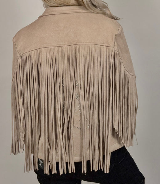 Flanked in long vegan suede fringe on all sides, Cowgirl Deluxe is just that with a glittering rhinestone cowboy hat peeking through the eyecatching fringe! This lightly structured open front jacket has a long tapered lapel, long sleeves, and fringe that seamlessly transitions from back yoke to the contoured sleeve caps.  92%POLYESTER 8%SPANDEX