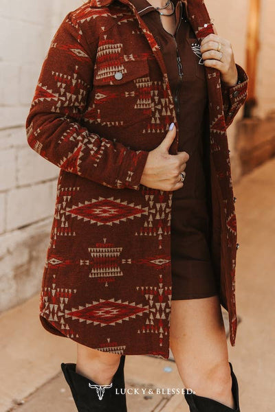 Step into fall fashion with our Rust Aztec Button Down Jacket Dress - a must-have statement piece for the bold Western woman. Designed with a rich rust base and all-over geometric Aztec patterns in earthy taupe and red tones, this dress brings a vibrant, vintage-inspired aesthetic. Crafted from soft fleece fabric, it delivers warmth and comfort without compromising on style. Featuring a structured shirt collar, long sleeves, and functional snap buttons down the front, it doubles as a shacket or dress for ultimate versatility. Chest flap pockets add a practical touch, while the flattering curved hemline and tailored fit ensure a polished silhouette. Pair it with cowboy boots for a full rodeo-ready look. Western jacket dress Aztec fleece shacket button-down shirt dress rust western dress fall western fashion tribal print jacket dress women's western outerwear rodeo dress wholesale Aztec shacket Lucky & Blessed wholesale NFR WESTERN RODEO WESTERN APPAREL