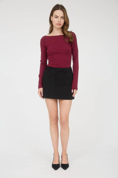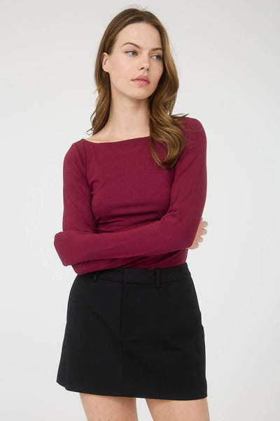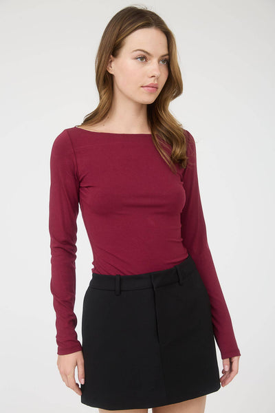 BOAT NECKLINE LONG SLEEVES FITTED SOLID NOT LINED LIGHTWEIGHT KNIT TOP 97%RAYON 3%SPANDEX