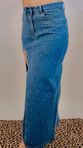 Denim Stretch Rhinestone Maxi Skirt with curved high slit