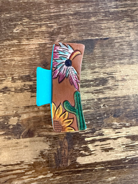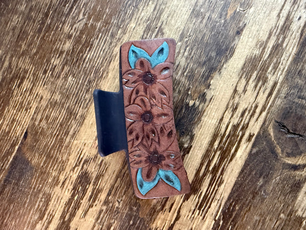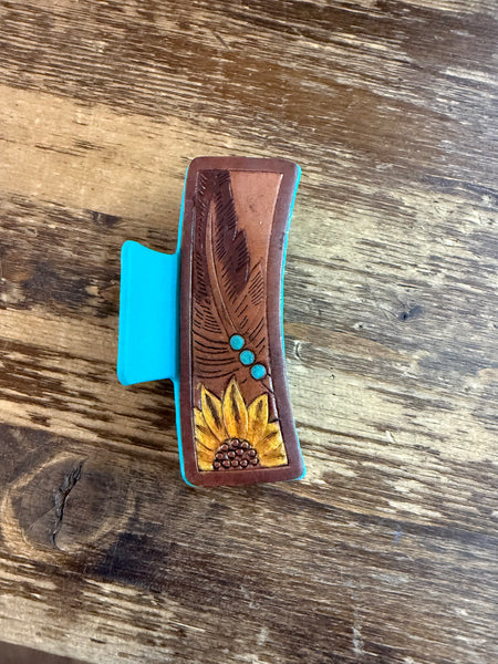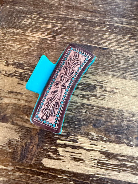 Large / Brown Clip: Turquoise Flowers - $12.00 USD