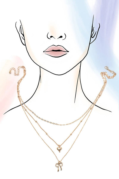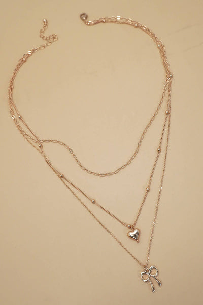 Multi-Layer Bow Heart Charm Drop Necklace, featuring delicate layers of charms, this necklace includes a charming bow and a heart-shaped pendant, crafted with high-quality materials, this necklace offers both durability and style.