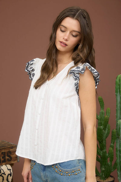 V NECKLINE SHORT SLEEVES RUFFLE SLEEVES EMBROIDERED FLORAL SLEEVE DETAIL CONTRAST SLEEVE DETAIL BUTTON DOWN NON-FUNCTIONAL BUTTON RELAXED FIT LIGHTWEIGHT STRIPE CLIPDOT PATTERN WOVEN TOP NOT LINED 100% COTTON